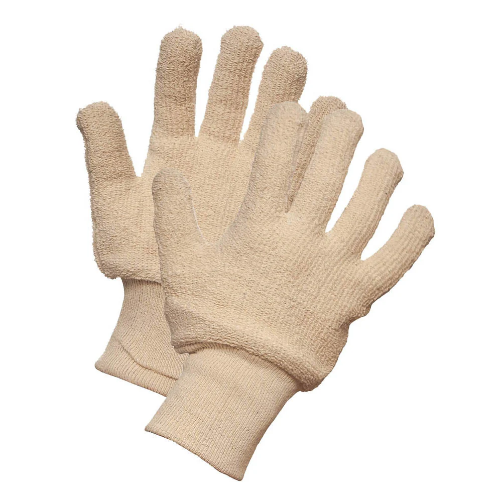 These Heat Resistant Terrycloth Gloves, crafted from terry-cloth, are designed for light to medium-duty tasks. Their unique terry loops circulate air, offering thermal resistance to keep hands cool, making them perfect for jobs requiring heat protection and comfort.