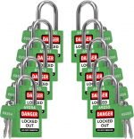 - Premium Tagout Lock – (10) Green lock out tag out locks with 1-1/2 inch long stainless steel shackle, 1/4-inch shackle diameter, 2 keys per lock